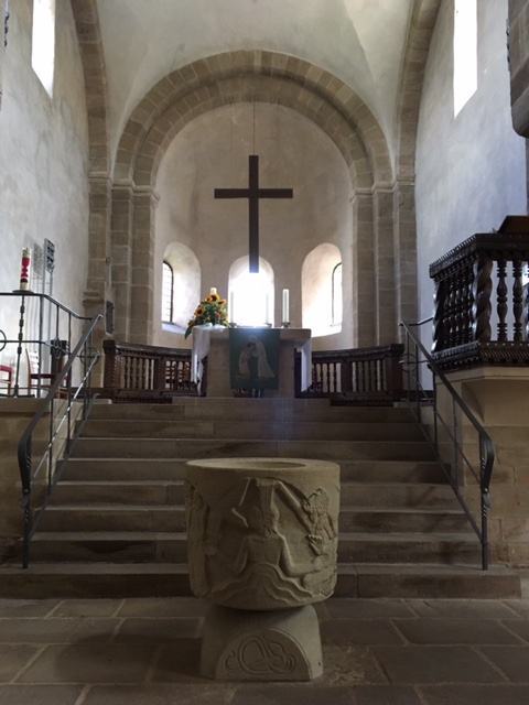 Die zwischen 1145-1170 erbaute Kirche lud dazu ein den Kirchenraum genauer zu betrachten. Und so wurde unter der Leitung der Jugendarbeiterin der Kirchenraum auf spezielle Art und Weise erkundet. Samstagabend im Schein von Taschenlampen erstrahlte die Kirche in einem ganz anderen Licht. Eine solche Betrachtungsweise schärfte den Blick für Details. Sonntagmorgen ging es mit vielen verschiedenen Methoden weiter: die sogenannte Kirchenraumpädagogik lenkt die Sinne in ungewöhnliche Richtungen und setzt neue Blickwinkel, welche immer wieder im gemeinsamen Austausch vorgestellt und ergänzt wurden.