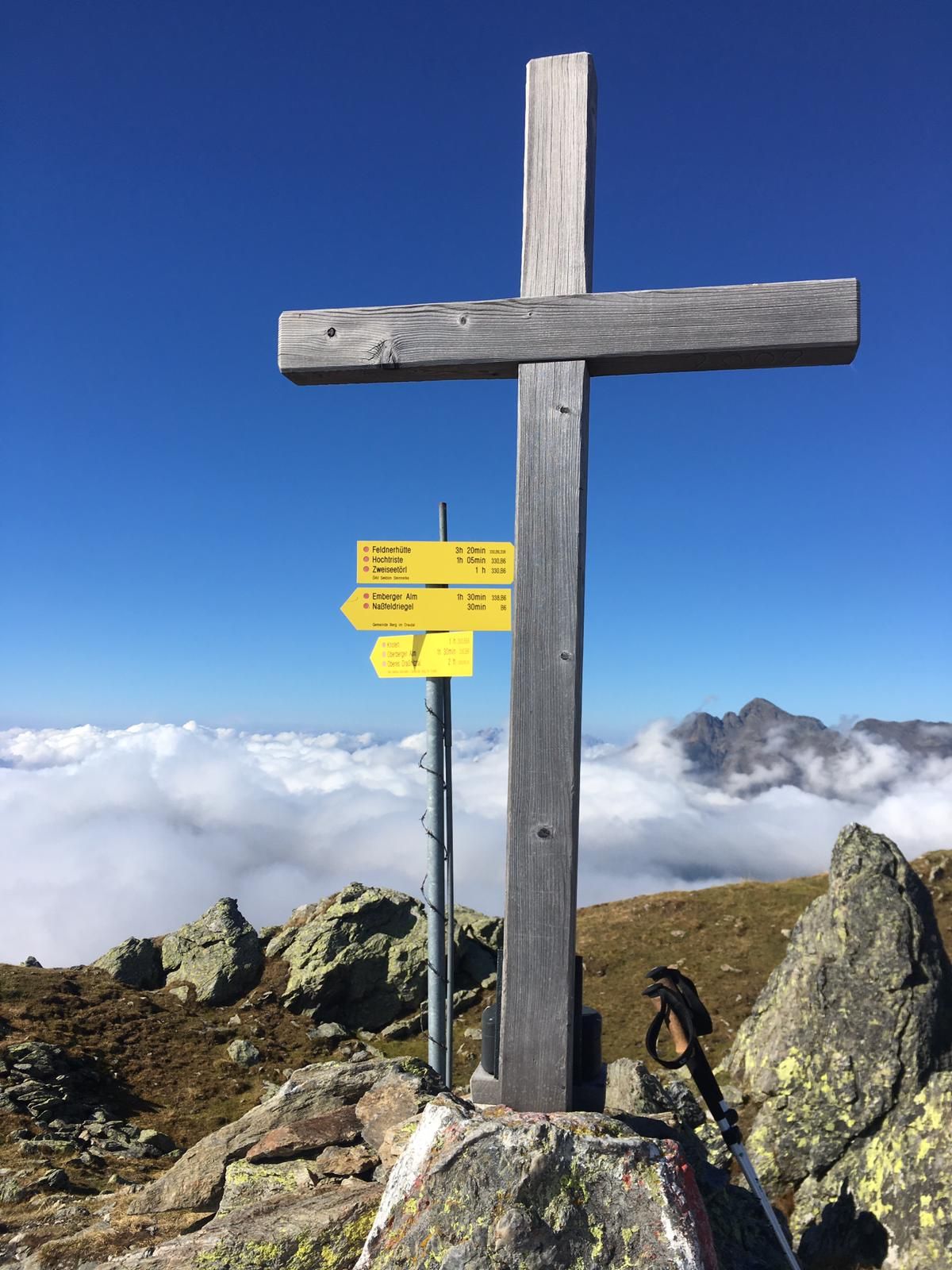 Da ich selbst mit der Gruppe 1 unterwegs war, möchte ich hiervon berichten. Wir starteten, begleitet von Tanja vom Fremdenverkehrsverein Berg von der Emberger Alm aus auf dem zusehends steiler werdenden Karrenweg. Man gelangt bis auf rund 2.000 Meter Seehöhe, bevor der Weg wieder bergab in die so genannte Kaserleiten führt. Danach führt der Steig auf dem Schwarzstein (2.264 m). Hier trugen wir uns alle in das Gipfelbuch ein. Ganz besonders war, dass wir „über den Wolken“ wanderten, wir sahen nur ein paar Berggipfel daraus hervorragen. Nach dem Schwarzstein ging der Weg über teilweise ausgesetzte Stellen, viele Felsbrocken und an teilweise mit Seilen gesicherten Wegen weiter. Den Abzweig zum Hochtristen sparten wir uns, da er extrem steil und felsig war. Hinter einem steilen Sattel erreichten wir dann die „Zwei Seen“. Traumhaft lagen sie da. Und wir dachten nach einem Impuls wieder über die geschenkten 86.400 Sekunden nach …. in Gottes unendlicher Schöpfung. Über einen steilen Abstieg über felsiges Gebiet, herrliche Wanderwege, einen Gegenanstieg und durch Gebiete mit traumhafter Aussicht gelangten wir zurück zur Emberger Alm. Wir waren mehr als 6 Stunden bergauf und bergab unterwegs gewesen und genossen auf einer Hütte Radler, Apfelstrudel und sehr leckeren Kaiserschmarrn. Ich selbst möchte mich an dieser Stelle ganz besonders bei Dieter, Horst und Tanja bedanken, die mir meine Angst bei den für mich sehr schwierigen Stellen dieser Tour nahmen und mich unterstützt und zuverlässig begleitet haben.