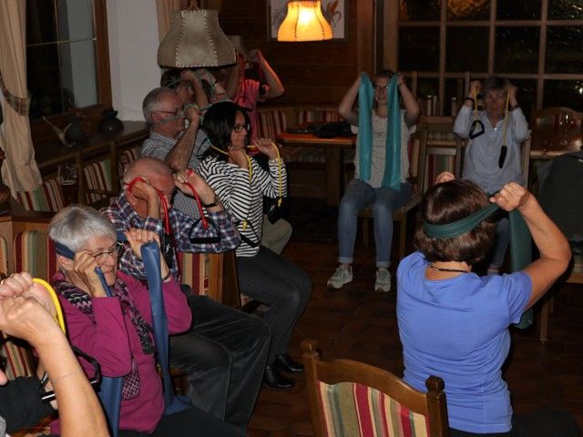 So war der Sonntag für alle ein Tag der entspannten Erholung. Damit wir aber nicht zu sehr in den Modus der Entspannung und Erholung kamen, brachten uns Angelika Fesser-Peterß und Anja Günther-Homburg am Abend mit dem Terraband in Bewegung und zum Schwitzen.