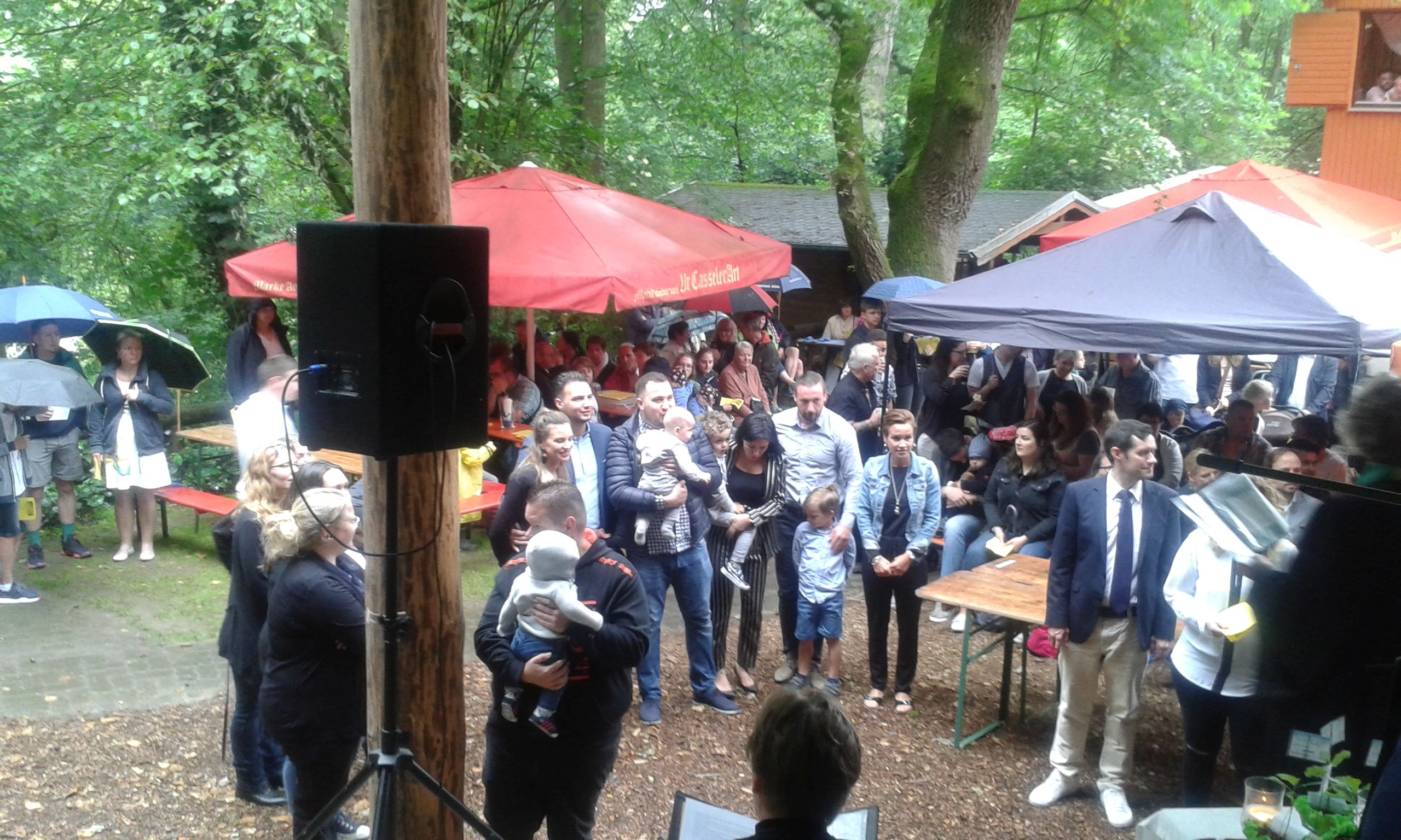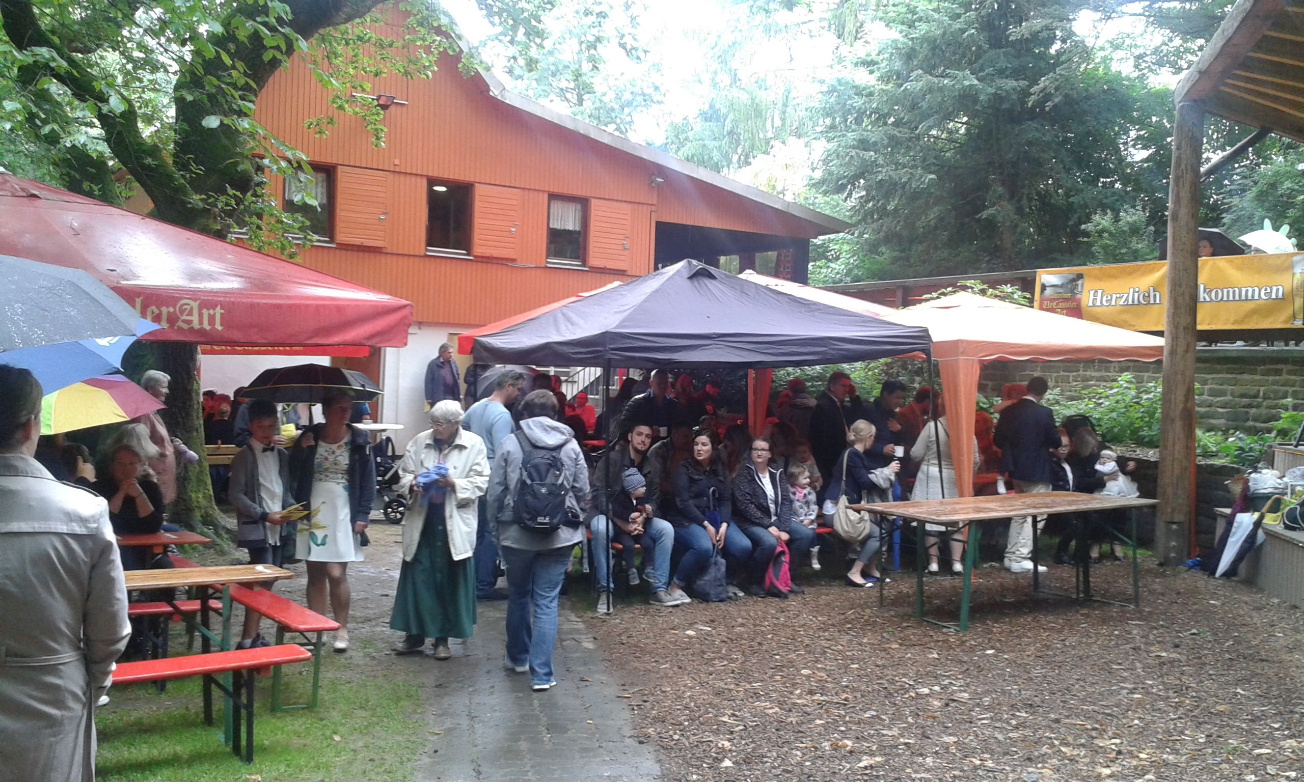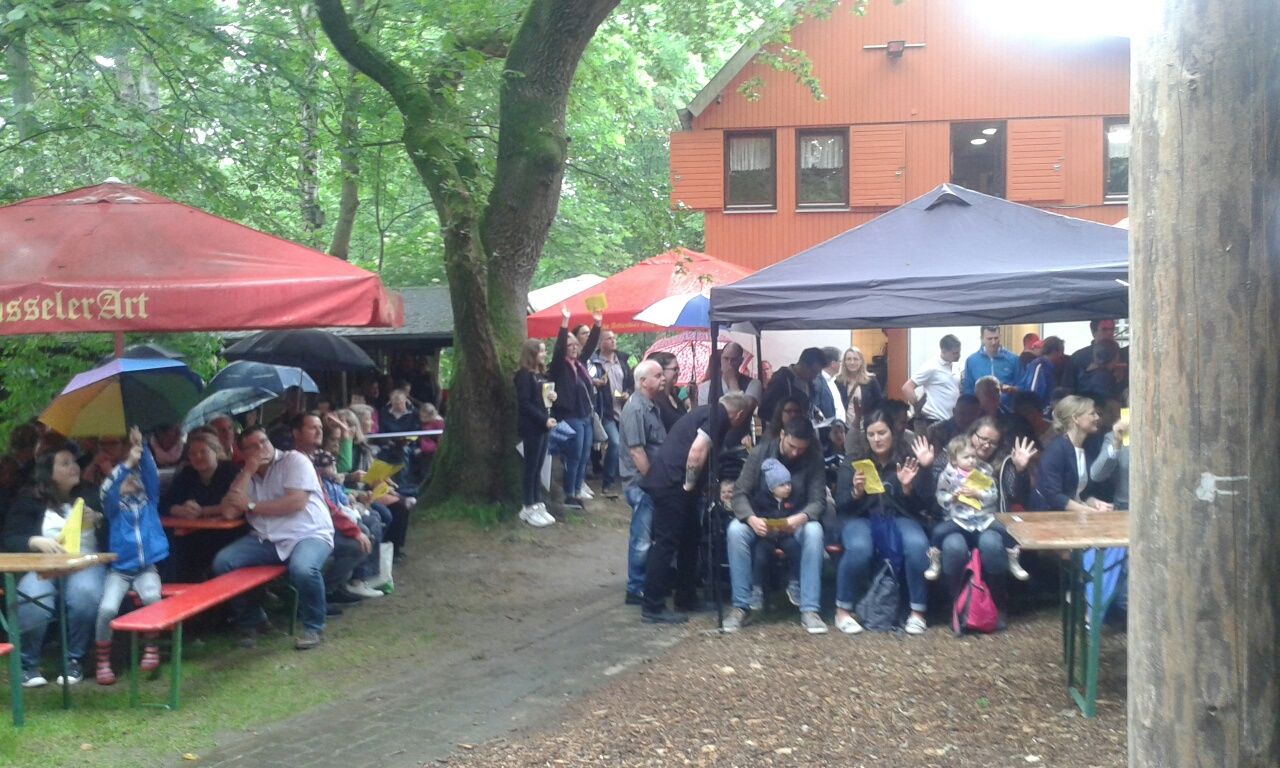 Lied, Gebet und Segen für alle rundeten den Gottesdienst ab. Nun wurde geschnuddelt, gegessen, getrunken und Taufe gefeiert und der Regen hatte mittlerweile nachgelassen. Es war ein gelungenes Fest für das wir alle sehr dankbar sind und das nur als Team so werden konnte wie es war. Darum noch einmal DANKE: den Naturfreunden für die fantastische Organisation, der Band der katholischen Kirchengemeinde Lohfelden für die schöne Musik, Pfarrerin Grimmell-Kühl für ihr Mitwirken, dem Team der ev. Kirche Vollmarshausen für die Begleitung des Gottesdienstes und allen wackeren Gottesdienstbesuchern, dass sie sich auf den Weg gemacht haben. Wir haben entschieden und geplant: am Sonntag, den 21. Juni 2020 um 11 Uhr werden wir wieder einen Taufgottesdienst am Naturfreundehaus feiern.