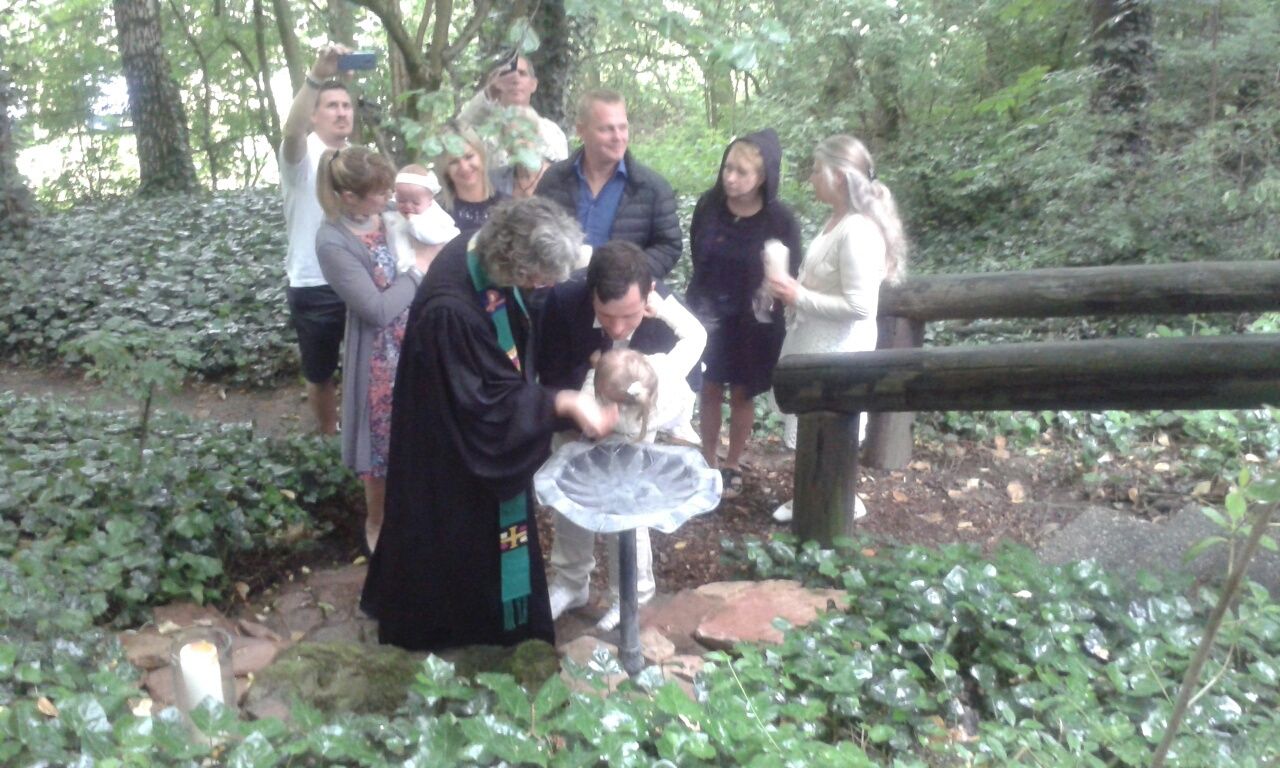 Zur Taufe begaben sich die einzelnen Familien zur extra für dieses Fest von den Naturfreunden freigelegten Quelle mit aufgestellter Taufschale, die idyllisch im Trockenen lag und schon aus diesem Grund eine ganz besondere Stimmung ausstrahlte. Die Familien und teilweise die Gemeinde konnten von oben die Taufe begleiten, während die Familie im engsten Kreis für sich war. Yuna, Brandon-Lee, Nea, Kani, Elas und Matteo meisterten diesen besonderen Ort und die Taufe mit doch recht frischem Quellwasser sehr gut, während Paten, Eltern und Geschwister berührt und sichtlich ergriffen von Gottes Segen an ihrer Seite waren. Die Taufkinder bekamen einen Eichensetzling geschenkt, der sie immer an ihre Taufe an einem besonderen Ort erinnern wird. Während der Taufe konnten alle anderen Kinder sich an ihre Taufe erinnern und ihr Taufvögelchen vom Baum abnehmen.