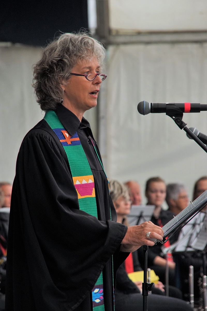 Auf das von Frau Grenzebach gesprochene Psalmgebet antwortete die Gemeinde mit „Dafür loben wir dich.“ Als Schriftlesung hörte die Gemeinde an diesem Morgen Worte aus dem 12. Kapitel des Römerbriefes, vorgetragen von Frau Prädikantin Jennifer Armbröster. „Eure Liebe muss aufrichtig sein. Verabscheut das Schlechte und lasst nicht ab vom Guten. Einer soll den anderen als Bruder herzlich lieben und ihn höher stellen als sich selbst. Lasst euch von Gottes Geist durchdringen und dienet bereitwillig dem Herrn.. Sorgt für alle im Volk Gottes die es nötig haben und wetteifert in der Gestfreundschaft.“ Nach dem gemeinsam gesprochenen Glaubensbekenntnis stimmten Orchester und Gemeinde „Komm' sag es allen weiter“ an.