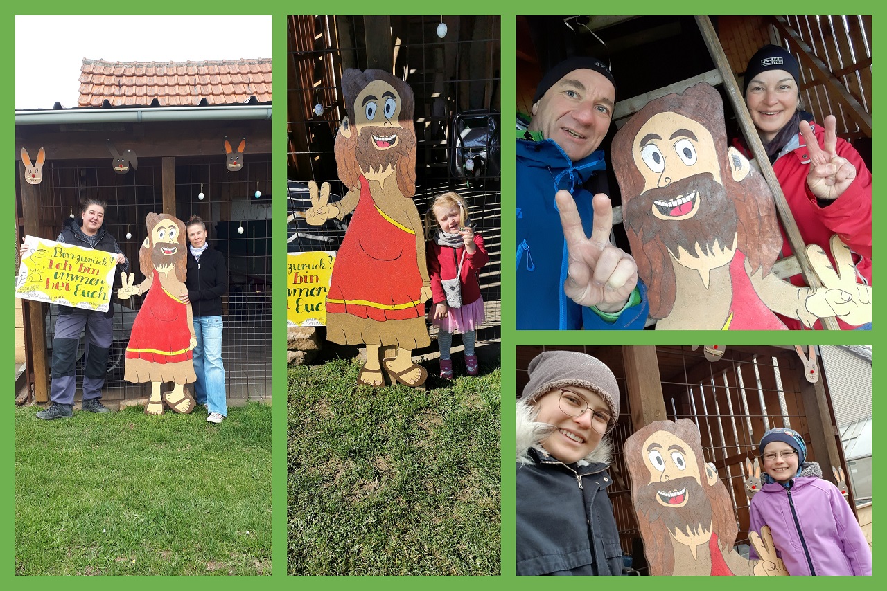 Einige Vollmarshäuser nutzten die Gelegenheit um ein „Jesus-Selfie“ zu machen. Etwas versteckt, auf Grund des wenig österlichen Wetters, stand Jesus am Feldweg bereit und hat sich über jede Begegnung gefreut. Wie es sich für Ostern gehört, wurde er sogar schon ab Gründonnerstag gesucht. Ab Ostersonntag stand er dann bereit und grüßte die Spaziergänger*innen. Viele lachten ihm zu, bestaunten ihn und ganz Mutige machten sogar ein Bild mit ihm. Ein Jesus zum Anfassen.