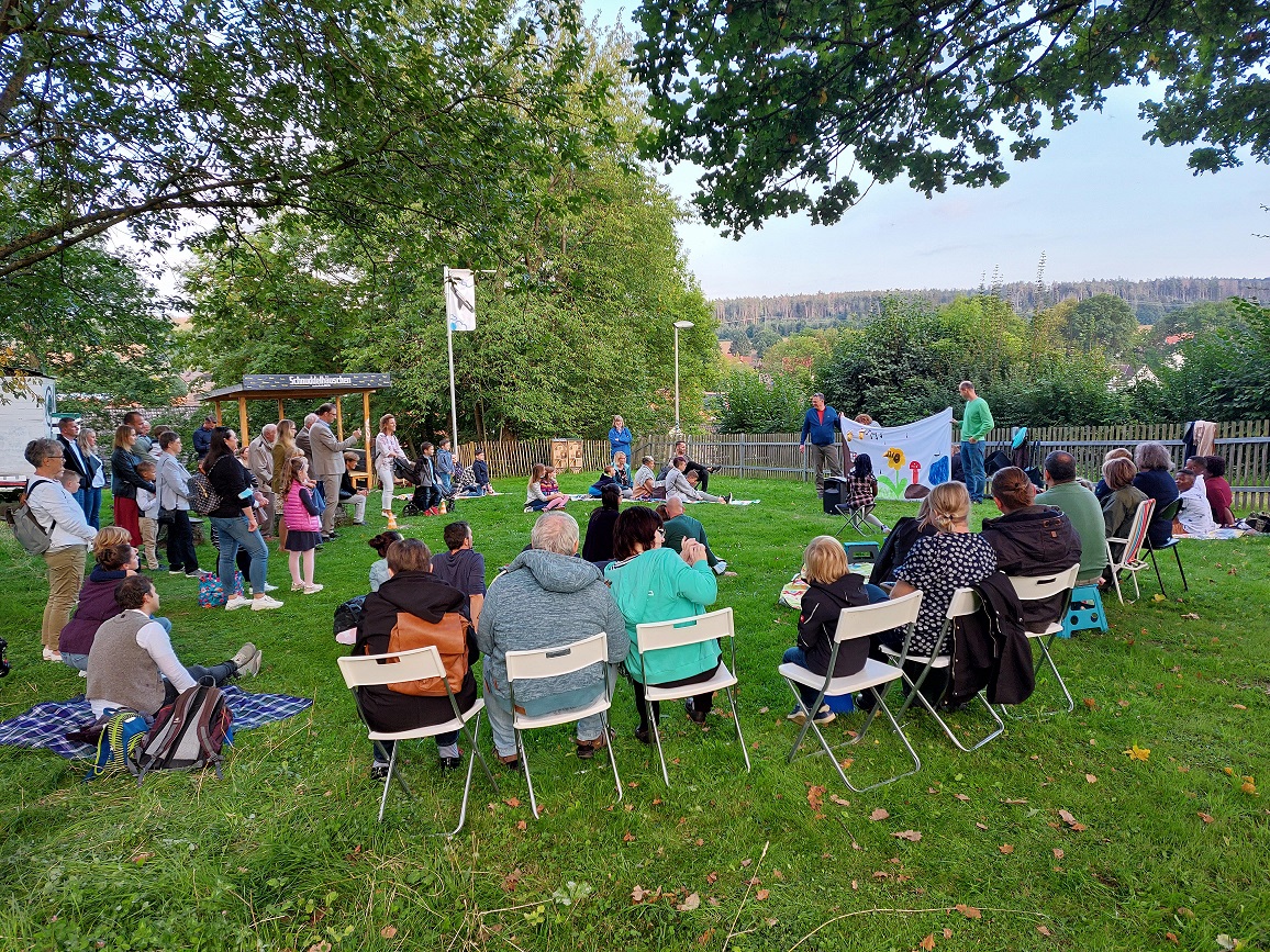 Wie bereits mehrfach erwähnt regt Corona die Kreativität und Flexibilität an. Das zeigte sich auch beim Schulanfang. Wie bereits im vergangenen Jahr fanden auch dieses Jahr am vergangenen Mittwoch zwei lebendige Gottesdienste zum Schulanfang im Archegarten bei bestem Wetter statt. Zu beiden Gottesdiensten waren über 20 Schulkinder mit ihren Eltern, Großeltern, Paten und Geschwistern gekommen und hatten bei fröhlichen Bewegungsliedern und dem Sockentheater mit der Hummel Bommel ziemlich viel Spaß. Sie saßen auf Klappstühlen oder Picknickdecken, standen auf der Wiese und genossen diesen schönen Ort. Am Ende des Gottesdienstes wurde jedes Schulkind und seine Familie gesegnet. Wir hoffen sehr, dass es euch gefallen hat und ihr durch Gottes Segen gestärkt und ermutigt den Weg in euer Schulleben könnt. Wir sagen zudem DANKE für die Kollekte in Höhe von 383,60 €, die für die Ausbildungshilfe ist.