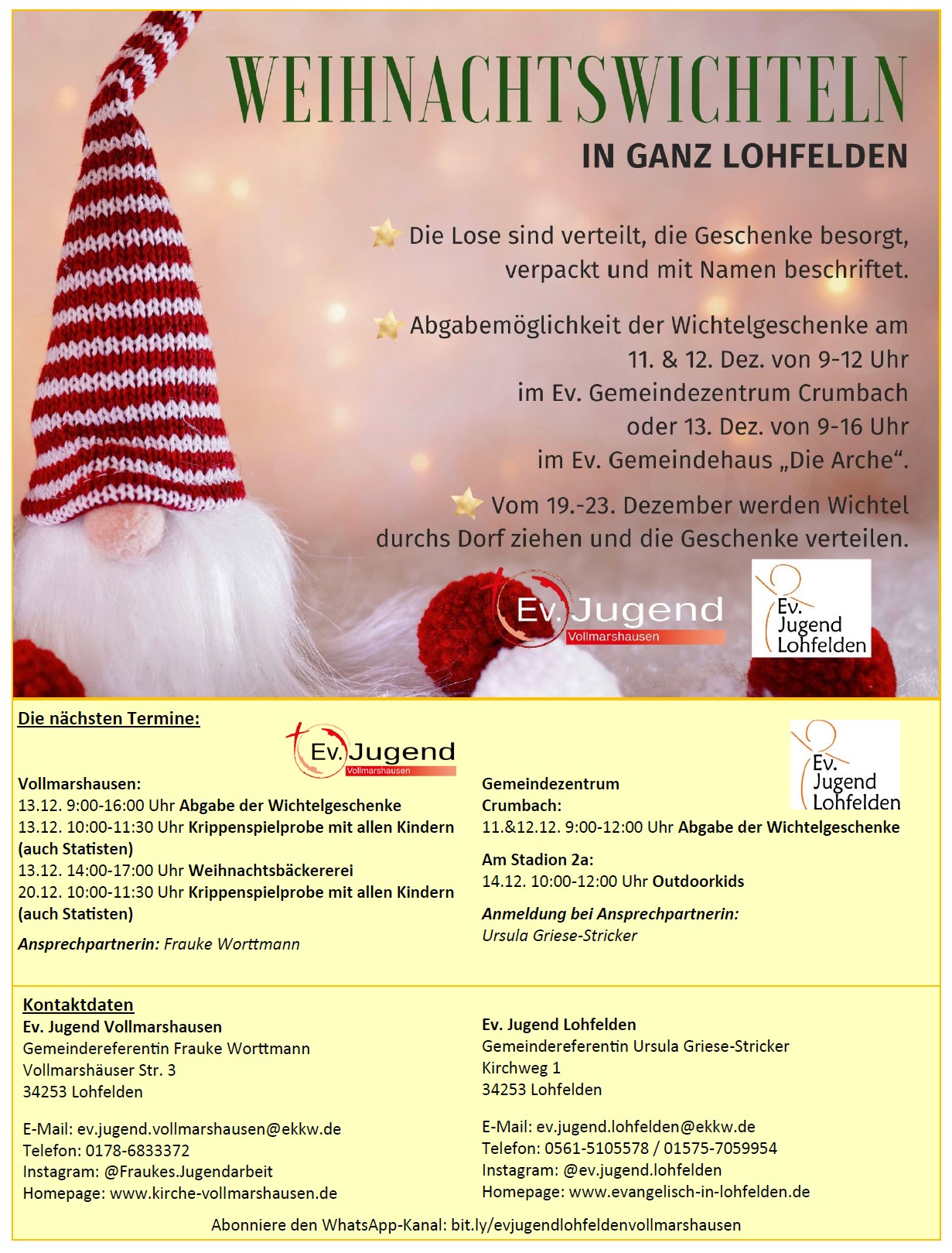 Hier kann man die Angebote der Kinder und Jugendarbeit einsehen. Nähere Information zu einzelnen Angeboten und den aktuellen Terminen erhält man bei Gemeindereferentin Frauke Worttmann oder im Blickpunkt Lohfelden.