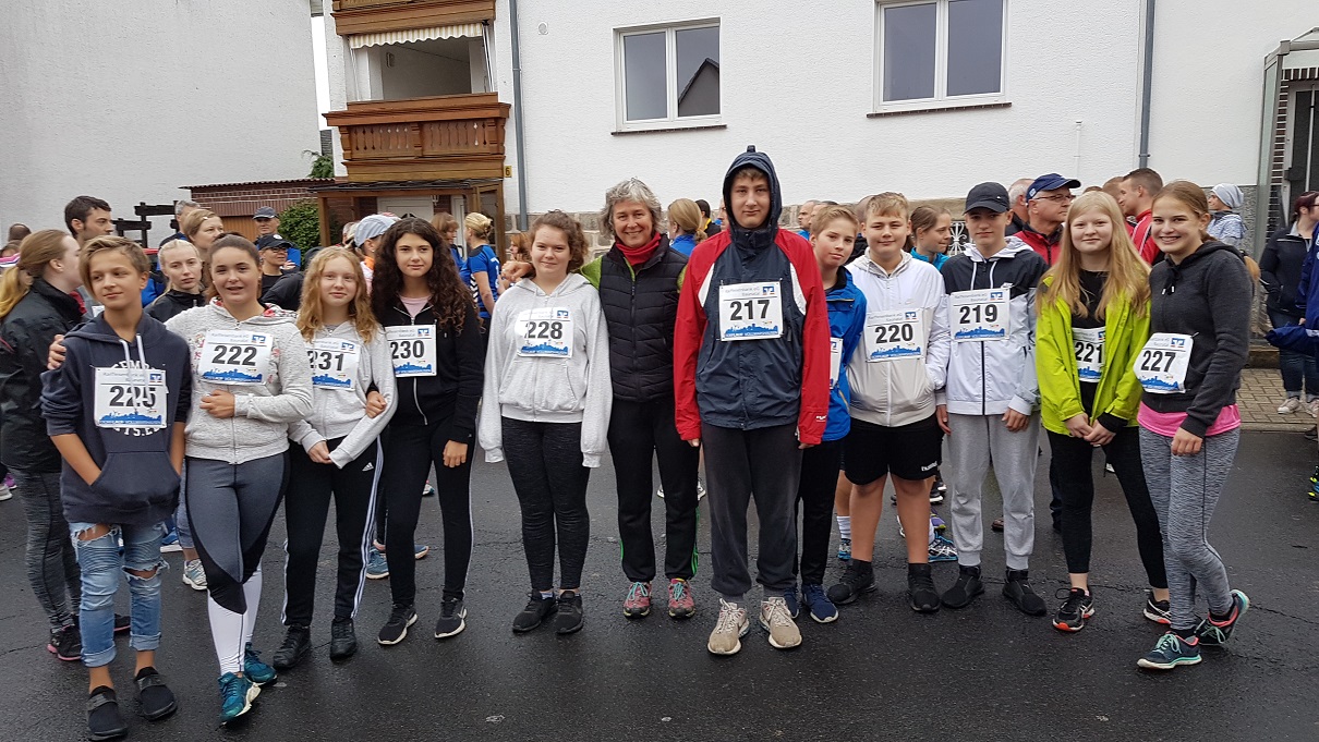 Kurz vor dem Start sahen die neun Konfirmandinnen und Konfirmanden, die zum Dorflauf bei Nieselregen gekommen waren ziemlich lustlos aus und hatten wirklich überhaupt keinen Bock, sich bei diesem Wetter anzustrengen und auf die fünf Kilometer lange Strecke zu gehen. Doch je näher der Start kam, desto freudiger wurden sie. Die Stimmung war gut und die anderen Läufer, die bereits mit den Hufen scharrten, steckten unsere Konfis an. Zudem kamen gerade die Schüler und Schülerinnen ins Ziel und auch der Anblick dieser engagierten Kindergesichter stachelte unsere Jugendlichen an. Hanna kam zum Anfeuern. Die vier Konfirmandinnen Loredana, Josephine, Anne und Michelle gingen gemeinsam an den Start. Luca und Filip waren vorne mit dabei und gaben richtig Gas. Sven und David ließen es etwas gemütlicher angehen, wurden aber von Runde zu Runde schneller. Es dauerte etwas bis die Gesichter rot aber auch glücklich leuchteten.