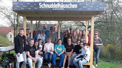 Im Januar hatten Ben Günther und Aaron Bruhns stellvertretend für ihre Konfi-Gruppe im Kirchenvorstand die Idee, den Grillplatz im Archegarten durch ein Schnuddelhäuschen zu erweitern, präsentiert. Das schlechte Wetter verzögerte das Bauvorhaben. In mehreren Arbeitseinsätzen konnte das Häuschen mit tatkräftiger Unterstützung der Eltern und Großeltern dann im März errichtet werden. Zuletzt wurde noch eine Tafel mit allen Namen der Konfirmandinnen und Konfirmanden angebracht.